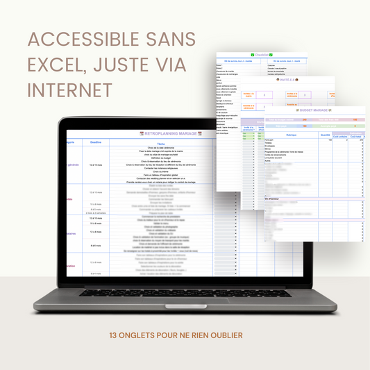 from 34 reviewsJ'avais peur de regretter d'investir dans un document excel mais mon dieu quel soulagement !! Ca me rassure tellement, je centralise toutes mes informations pour le jour j, la feuille de route est super bien construite et m'évite de ne pas m'éparpiller dans tous les sens. Un vrai gain de temps et un véritable réducteur de stress, on reprend plaisir à organiser le mariage.